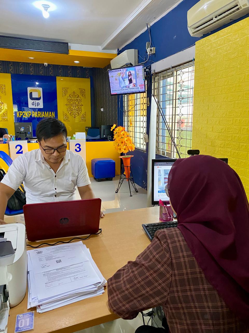 Kantor Pelayanan, Penyuluhan, dan Konsultasi Perpajakan (KP2KP) Pariaman memberikan konsultasi kepada wajib pajak yang datang ke ke Tempat Pelayanan Terpadu (TPT) untuk instal dan belajar e-Faktur 4.0 (Selasa, 30/7).