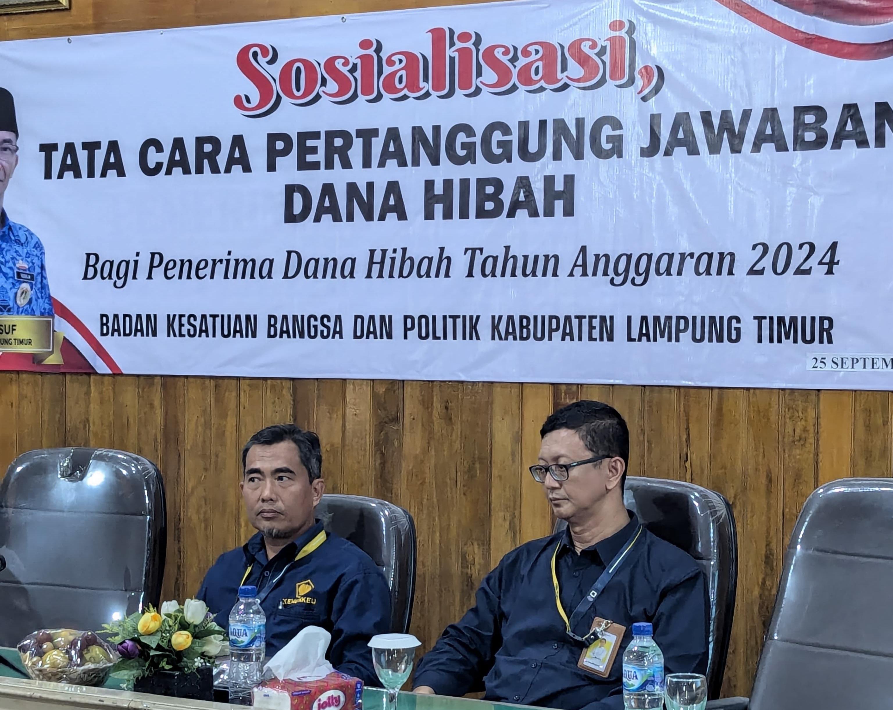 Kantor Pelayanan, Penyuluhan, dan Konsultasi Perpajakan (KP2KP) Sukadana dan Kantor Pelayanan Pajak (KPP) Pratama Metro bersama Badan Kesatuan Bangsa dan Politik (Bakesbangpol) Kabupaten Lampung Timur mengadakan sosialisasi tata cara pertanggungjawaban dana hibah bagi penerima dana hibah tahun anggaran 2024. Kegiatan ini dilaksanakan di Aula Atas Setdakab Lampung Timur, Kab. Lampung Timur (Rabu, 25/9).