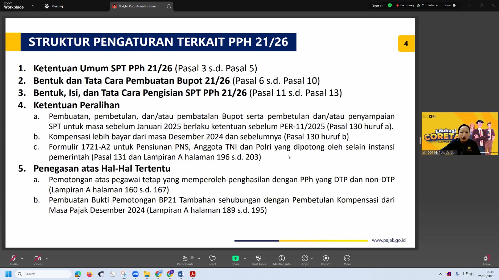 Agar wajib pajak mengetahui aturan baru tersebut, Kantor Pelayanan Pajak (KPP) Madya Denpasar menyelenggarakan edukasi perpajakan dengan tema Pembuatan Bukti Pemotongan 21/26 dan SPT Masa PPh Pasal 21/26 di Coretax secara daring (25/6).