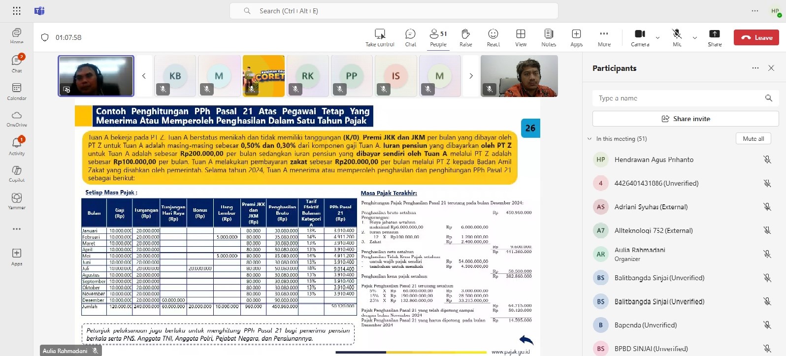 Kelas pajak daring ini merupakan tindak lanjut atas permintaan Pemerintah Daerah Kabupaten Sinjai guna meningkatkan kapasitas pengelola keuangan daerah dalam implementasi perpajakan melalui Coretax DJP. Sebanyak 67 bendahara instansi pemerintah se-Kabupaten Sinjai mengikuti kegiatan tersebut.