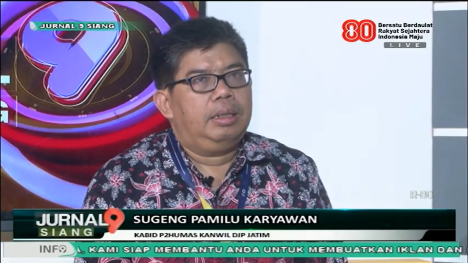 Kanwil DJP Jawa Timur I hadir dalam gelar wicara bertema “Pajak untuk Pemberdayaan UMKM” yang disiarkan langsung oleh TV 9 Nusantara di Kota Surabaya (Selasa, 19/8). Sugeng Pamilu Karyawan, hadir sebagai narasumber utama dalam dialog tersebut.