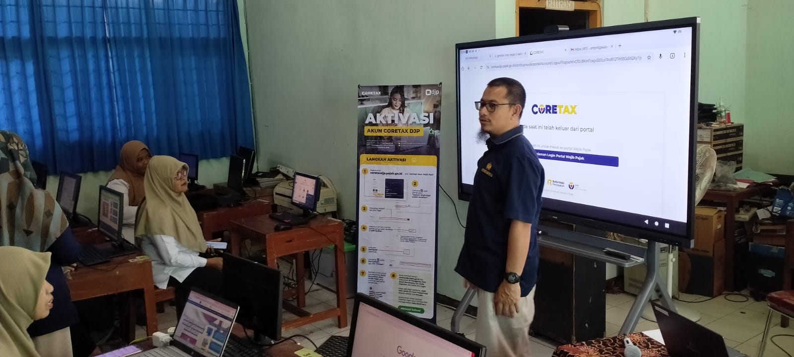 Dalam sesi praktik, peserta dipandu langsung untuk membuka laman https://coretaxdjp.pajak.go.id dan melakukan aktivasi akun masing-masing. Proses dimulai dengan memilih menu Aktivasi Akun Wajib Pajak, kemudian masuk ke Manajemen Kasus. Peserta diminta mencentang pernyataan “Apakah Wajib Pajak sudah terdaftar?” lalu mengisi data diri berupa NPWP 16 digit atau NIK, alamat email, dan nomor telepon yang telah terdaftar di DJP Online.