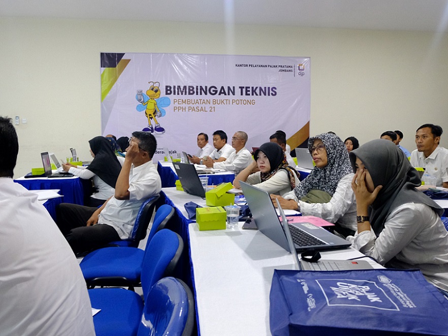 Dalam rangka pelaporan SPT Tahunan Tahun Pajak 2019, KPP Pratama Jombang melaksanakan Bimbingan Teknis (Bimtek) Pembuatan Bukti Potong PPh Pasal 21 di aula kantor (Kamis, 23/1). Bimtek yang dihadiri oleh Bendahara SKPD dan Bendahara Satker Vertikal di wilayah Kabupaten Jombang ini diselenggarakan selama empat hari sejak Senin, 20 Januari 2020.