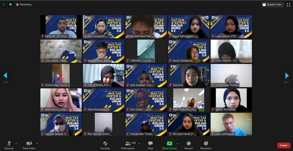 Sebanyak 424 keluarga besar kampus di Kalimantan Timur dan Utara mengikuti Kuliah Umum 3.0 yang diselenggarakan Kantor Wilayah (Kanwil) Direktorat Jenderal Pajak (DJP) Kalimantan Timur dan Utara (Kaltimtara) di Balikpapan (Rabu, 4/11). Melalui Zoom Clouds Meeting, Kepala Kanwil DJP Kaltimtara menyapa dan memberikan edukasi kepada para peserta.