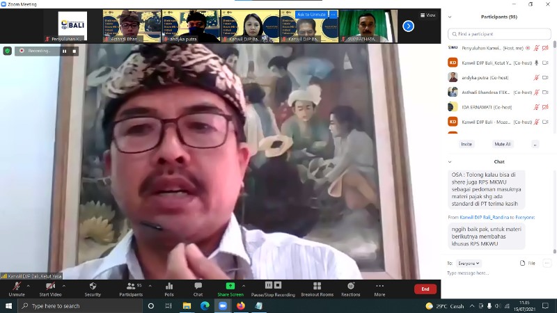Kantor Wilayah Direktorat Jenderal Pajak Bali (Kanwil DJP Bali) mengadakan Bimbingan Teknis Dosen Mitra Inklusi Tahun 2021 melalu media zoom di Bali (Kamis, 15/7). Kegiatan ini dihadiri oleh 33 Perguruan Tinggi di Bali yang telah menjalin kerja sama terkait Inklusi Kesadaran Pajak.