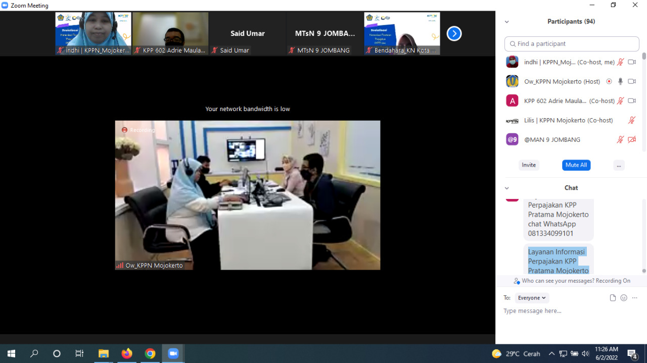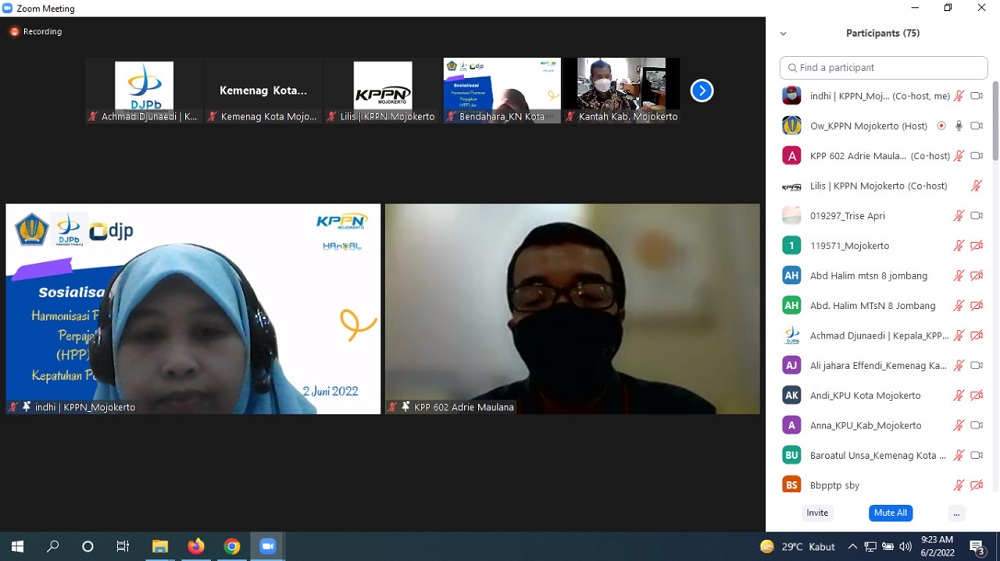 Kantor Pelayanan Pajak (KPP) Pratama Mojokerto bersama Kantor Pelayanan Perbendaharaan Negara (KPPN) Mojokerto menggelar Sosialisasi Undang-Undang Harmonisasi Peraturan Perpajakan (UU HPP) secara daring melalui aplikasi Zoom Meeting di Kota Mojokerto (Kamis, 2/6).