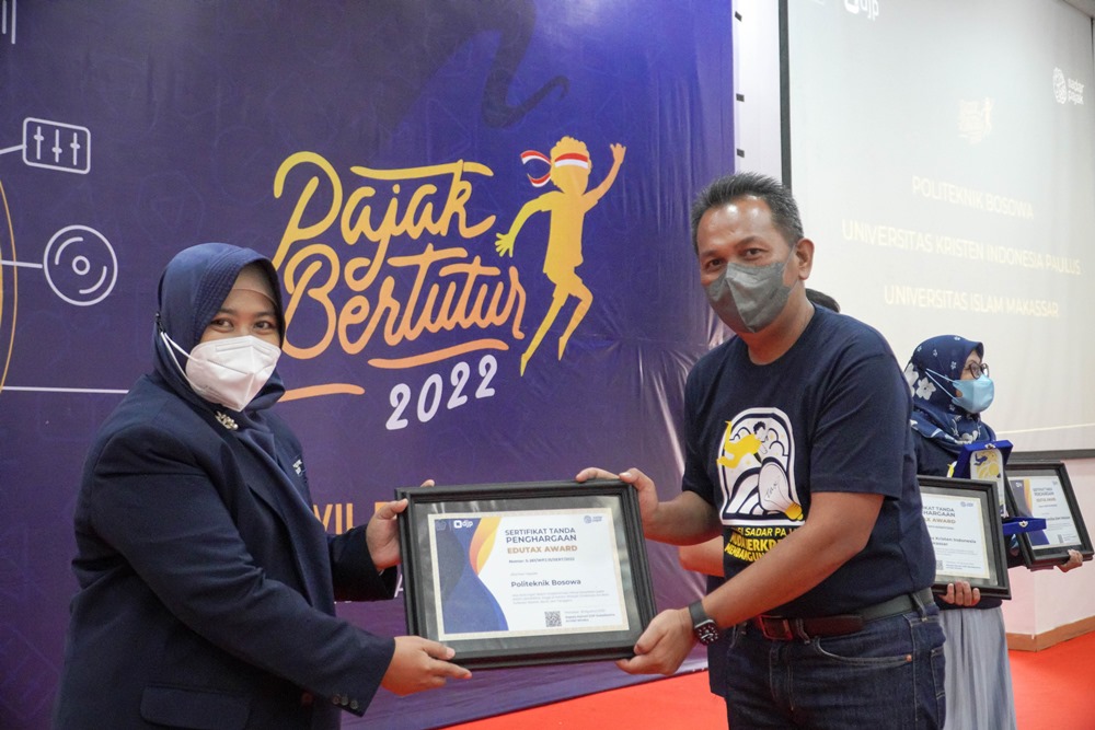Kanwil DJP Sulawesi Selatan, Barat, dan Tenggara (Sulselbartra) memberikan penghargaan pada tiga perguruan tinggi mitra yang telah berperan dalam menjalankan Program Inklusi Kesadaran Pajak yakni Politeknik Bosowa, Universitas Kristen Indonesia Paulus, dan Universitas Islam Makassar (Kamis, 18/8). Seremonial penyerahan penghargaan ini dilangsungkan bersamaan dengan kegiatan Pajak Bertutur 2022 dengan tajuk “Generasi Sadar Pajak, Muda Berkreasi Membangun Negeri” yang diselenggarakan secara tatap muka di ruang aula gedung Balai Diklat Keuangan, Kota Makassar.