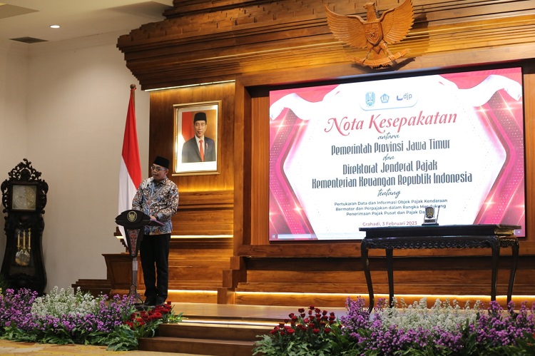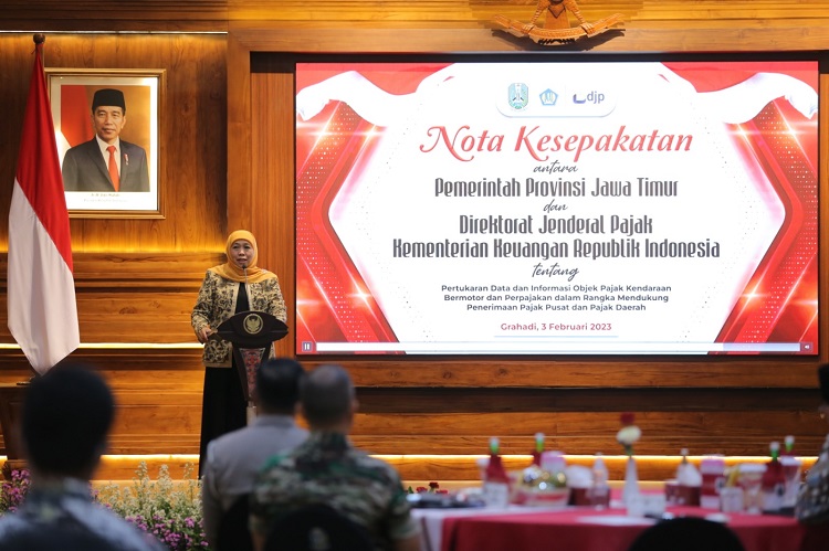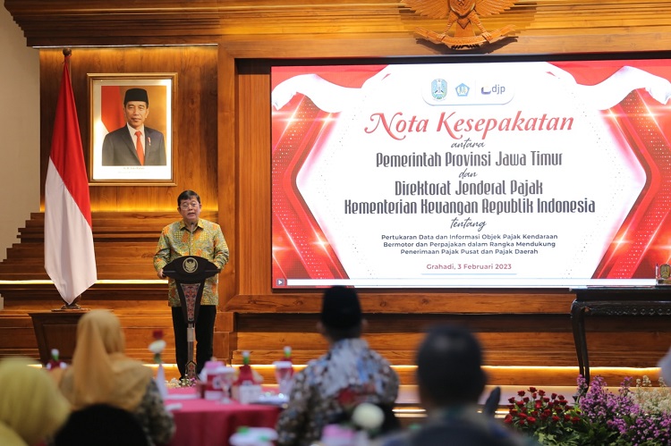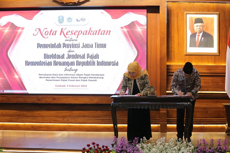 Direktur Jenderal Pajak Suryo Utomo dan Gubernur Jawa Timur Khofiifah Indar Parawansa melakukan penandatanganan Nota Kesepakatan Pertukaran Data dan Informasi Objek Pajak Kendaraan Bermotor dan Perpajakan dalam rangka Optimalisasi Penerimaan Pajak Pusat dan Pajak Daerah di Ruang Sisi Barat Gedung Negara Grahadi, Surabaya (Jumat, 3/2).