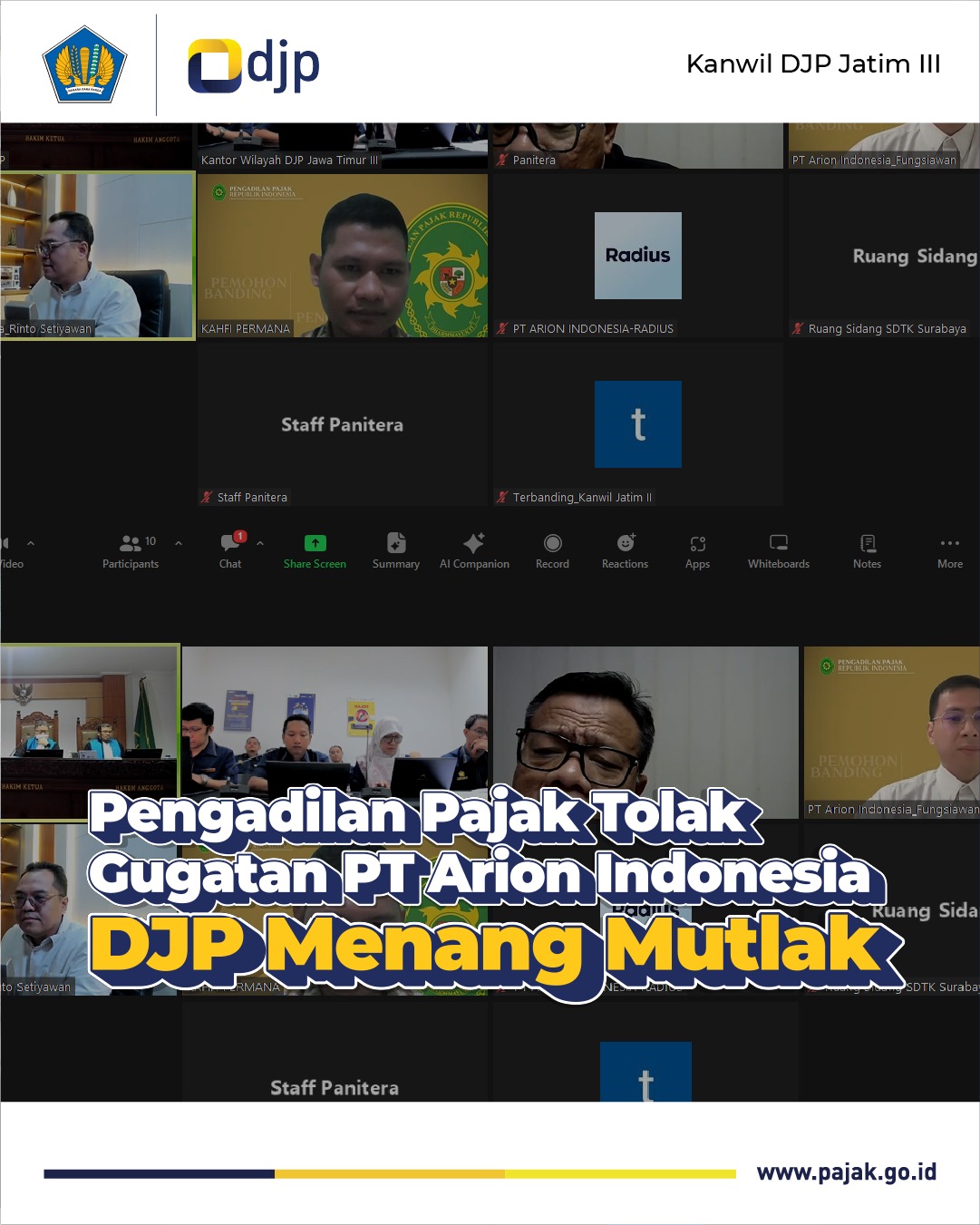 Direktorat Jenderal Pajak (DJP) berhasil memenangkan kasus gugatan perpajakan yang diajukan oleh PT Arion Indonesia ke Pengadilan Pajak (Jumat, 27/9). Putusan ini mengukuhkan bahwa seluruh proses pemeriksaan yang dilakukan oleh DJP telah sesuai dengan aturan hukum yang berlaku.