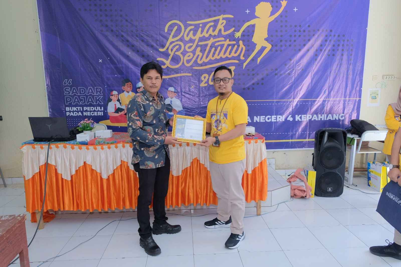 Kepala SMA Negeri 4 Kepahiang Zawil Fathoni pada sambutannya mengucapkan rasa terima kasih kepada KP2KP Kepahiang atas diselenggarakannya Pajak Bertutur di SMA Negeri 4 Kepahiang. Kepala KP2KP Kepahiang Syafril Arifin memberikan plakat dan sertifikat sebagai bentuk apresiasi dan terima kasih kepada SMA Negeri 4 Kepahiang yang telah menjadi peserta kegiatan yang memiliki slogan “Pajak Bertutur 2023: Sehari Mengenal, Selamanya Bangga” ini.