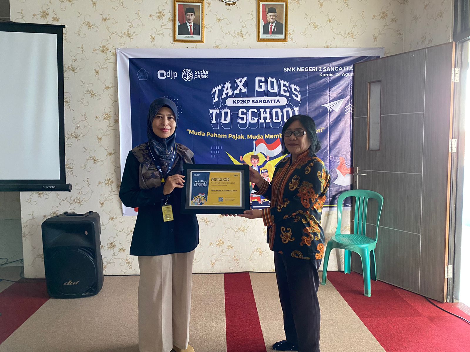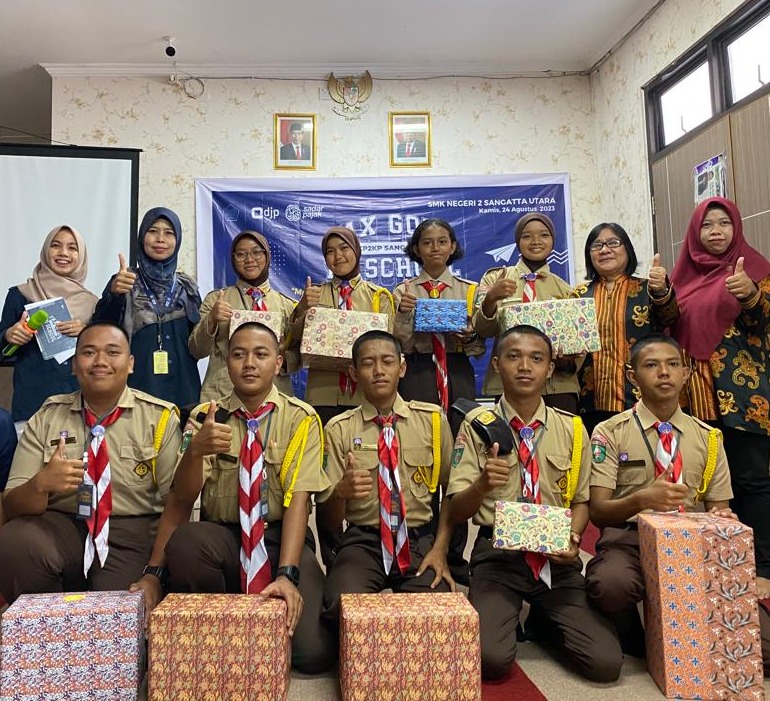 Kantor Pelayanan, Penyuluhan, dan Konsultasi Perpajakan (KP2KP) Sangatta mengadakan Tax Goes To School 2023 di SMK Negeri 2 Sangatta Utara, Kota Sangatta, Kabupaten Kutai Timur (Kamis, 24/8). Tax Goes to School 2023 mengambil tema "Muda Paham Pajak, Muda Membangun Negeri" dengan membawakan materi pengenalan terkait keuangan dan fungsi-fungsi pajak secara dasar.