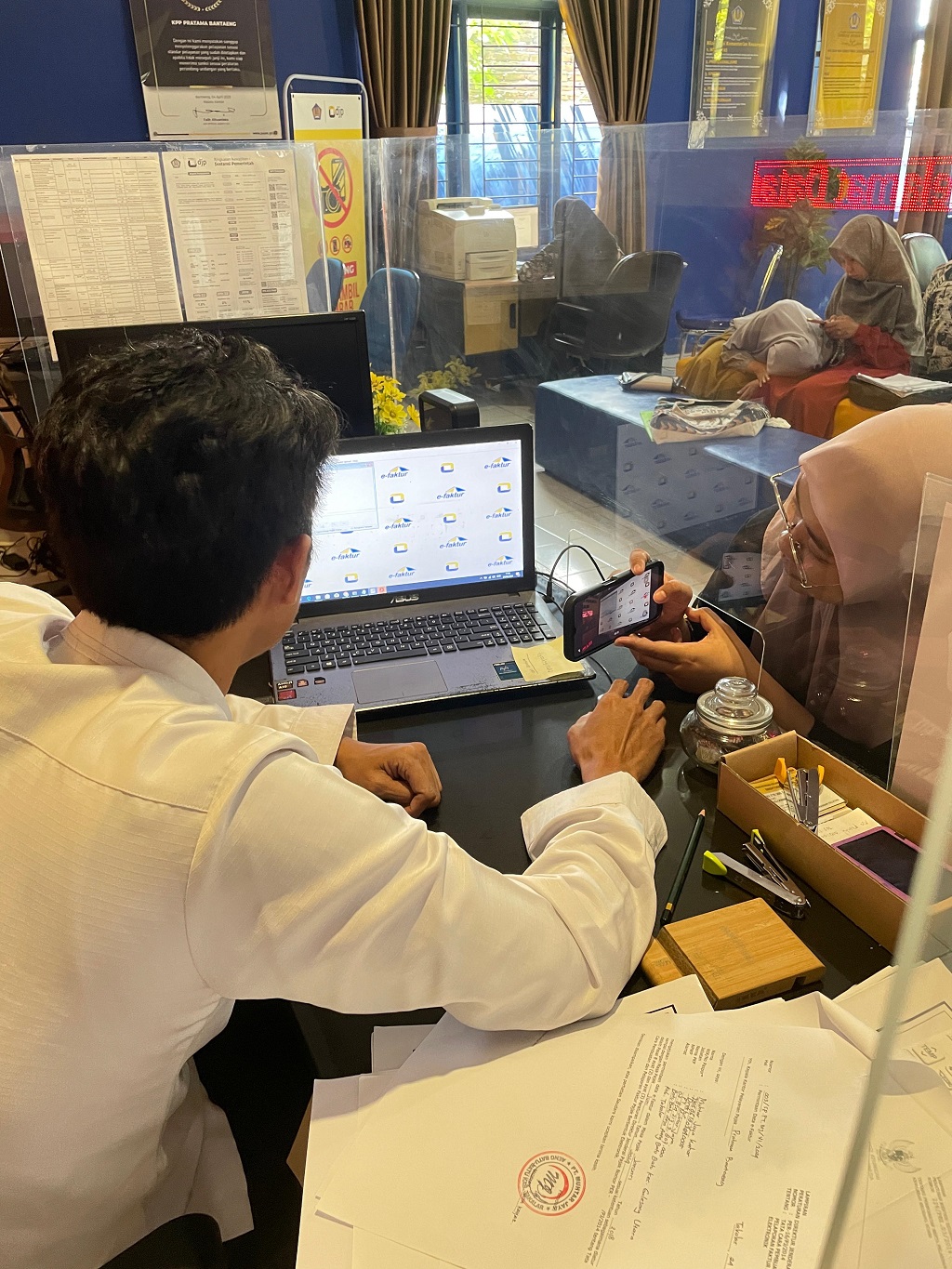 Kantor Pelayanan, Penyuluhan, dan Konsultasi Perpajakan (KP2KP) Takalar menerima kunjungan Wajib Pajak Badan yang berstatus Pengusaha Kena Pajak (PKP) di loket Tempat Pelayanan Terpadu (TPT) KP2KP Takalar. Kunjungan wajib pajak dalam rangka untuk berkonsultasi kendala saat install ulang aplikasi e-Faktur dan import data faktur pajak (Senin, 24/6).