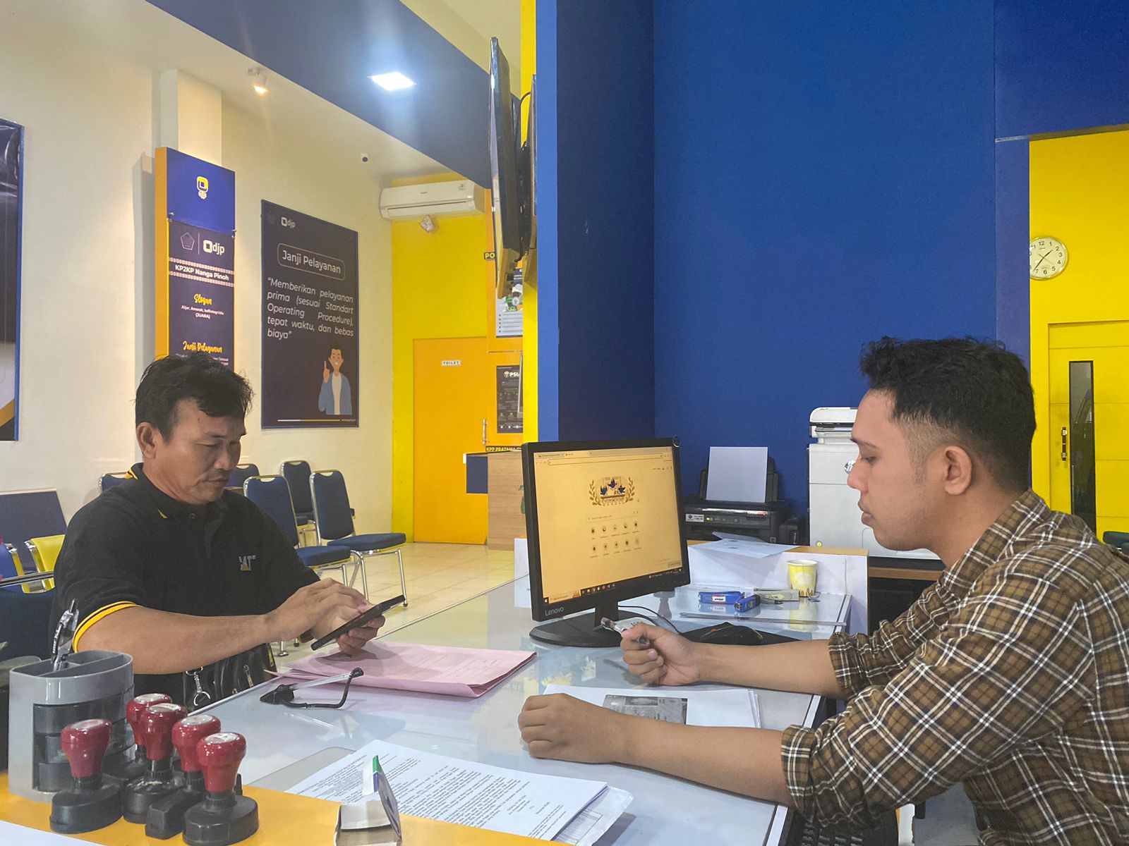 Petugas Pelayanan Kantor Pelayanan, Penyuluhan, dan Konsultasi Perpajakan (KP2KP) Nanga Pinoh memberikan sesi asistensi dan konsultasi kepada wajib pajak terkait syarat perolehan kartu nomor pokok wajib pajak (NPWP) di tempat pelayanan terpadu KP2KP Nanga Pinoh, Kabupaten Melawi (Selasa, 30/7). Diketahui bahwa wajib pajak tersebut hendak mendaftarkan anaknya menjadi wajib pajak.