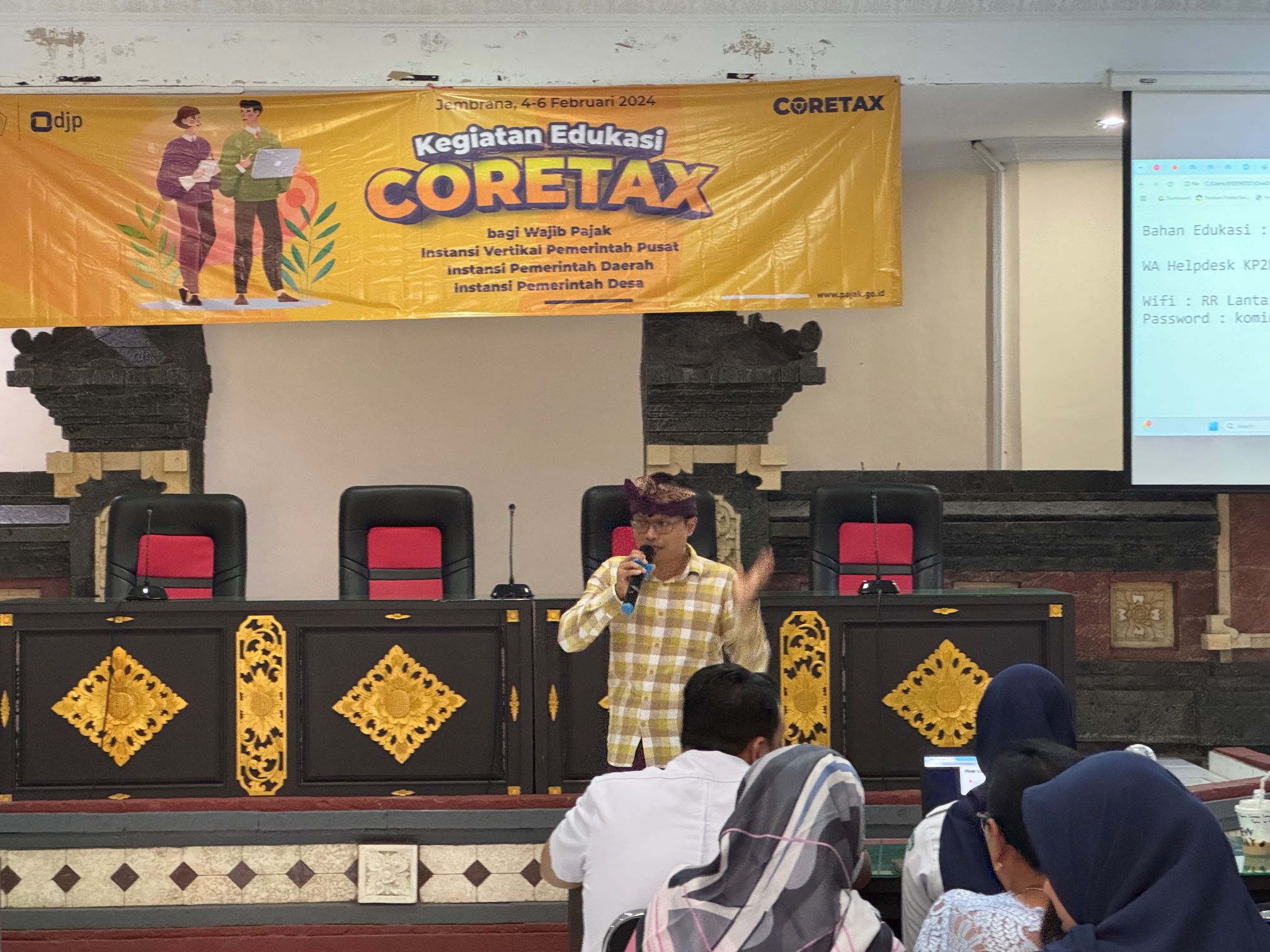 Kantor Pelayanan, Penyuluhan, dan Konsultasi Perpajakan (KP2KP) Negara bersama Account Representative (AR) Kantor Pelayanan Pajak (KPP) Pratama Tabanan menyelenggarakan sosialisasi aplikasi Coretax DJP di Aula Jimbarwana Kantor Bupati Jembrana, Jalan Surapati Nomor 1 Negara, Kabupaten Jembrana (Selasa-Kamis, 4/2-6/2). Sosialisasi aplikasi Coretax DJP ini diikuti oleh seluruh bendahara desa, bendahara Organisasi Perangkat Daerah (OPD), dan bendahara instansi vertikal di Lingkungan Kabupaten Jembrana.