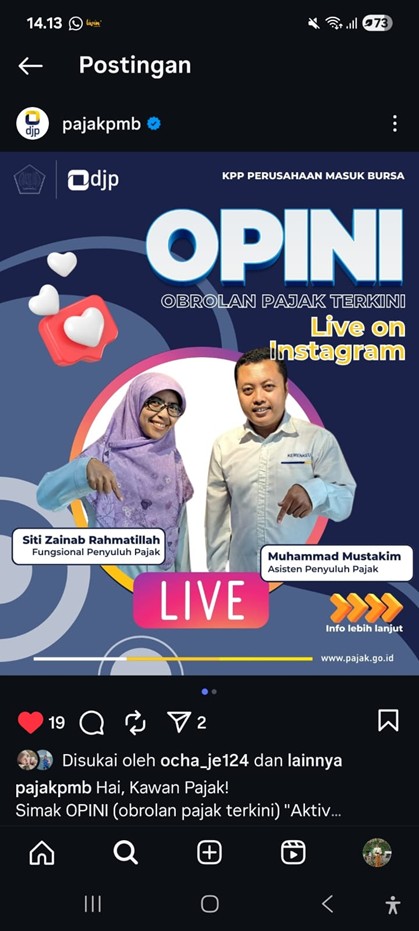 Saat live IG berlangsung beberapa wajib pajak secara aktif mengajukan pertanyaan melalui kolom komentar. Bagi wajib pajak yang tidak sempat mengikuti live IG ini, masih dapat menonton rekaman dari live IG tersebut yang telah disiarkan pada akun Instagram KPP PMB di @pajakpmb.