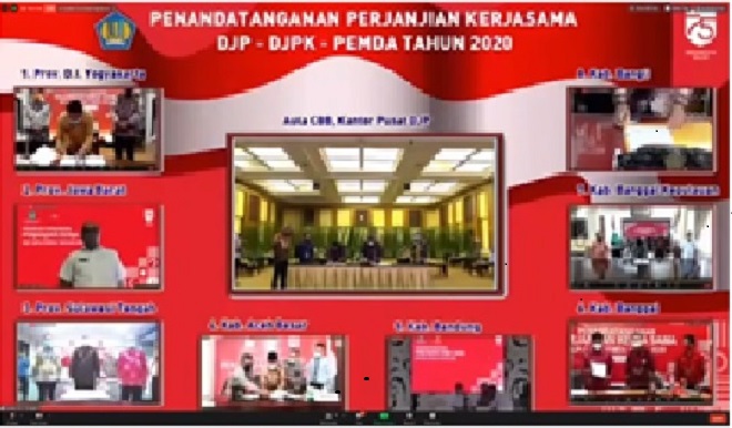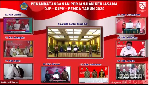 Pemerintah Provinsi Jawa Barat (Jabar) dan Sembilan Pemerintah Kabupaten/Kota di Jawa Barat turut menandatangani Perjanjian Kerja Sama Optimalisasi Penerimaan Pajak Pusat dan Daerah bersama Direktorat Jenderal Pajak (DJP) dan Direktorat Jenderal Perimbangan Keuangan (DJPK) Kementerian Keuangan melalui media telekonferensi yang dipandu dari Aula Cakti Buddhi Bakti, Gedung Mar’ie Muhammad, Kantor Pusat DJP (Rabu, 26/8).