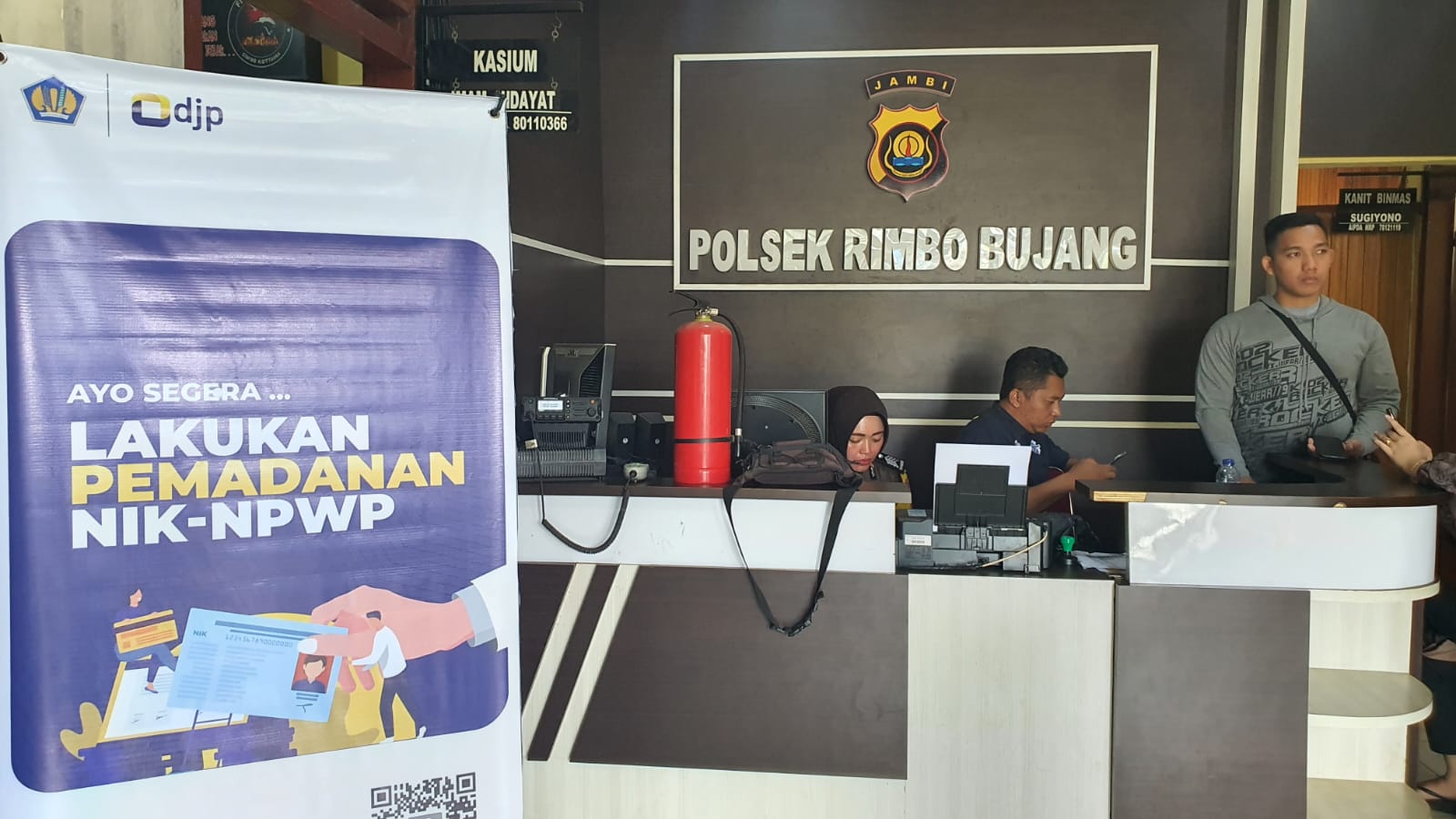 Kantor Pelayanan Penyuluhan dan Konsultasi Perpajakan (KP2KP) Rimbo Bujang berkolaborasi dengan KPP Pratama Muara Bungo dalam menyelenggarakan kegiatan Pojok Pajak di Polres Rimbo Bujang (Kamis, 26/1). Pojok pajak kali ini memberikan pelayanan berupa asistensi pengisian pelaporan SPT Tahunan secara online (e-filing), pemutakhiran pemadanan data Nomor Induk Kependudukan (NIK), dan konsultasi perpajakan. Petugas pojok pajak ini terdiri dari satu Asisten Penyuluh KPP Pratama Muara Bungo, tiga Pelaksana KPP Pratama Muara Bungo, dan satu pelaksana KP2KP Rimbo Bujang. Petugas juga memberikan nomor layanan Whatsapp yang bisa dihubungi bila ada pertanyaan lebih lanjut terkait perpajakan.