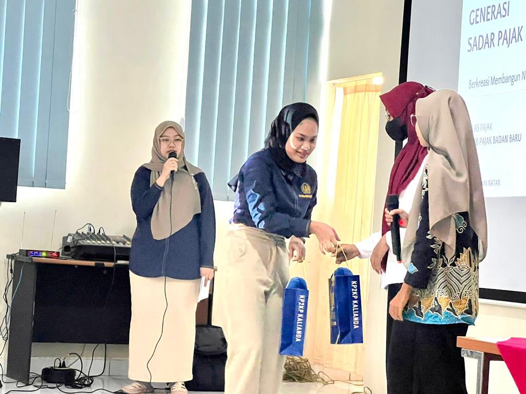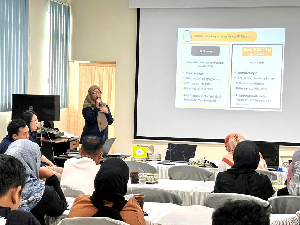 Pemaparan materi perpajakan disampaikan oleh Dimitra Prima Putri selaku Asisten Penyuluh Pajak Mahir KPP Pratama Natar. Dimitra menjelaskan pentingnya pajak bagi negara, konsep dasar pembuatan laporan keuangan, cara penghitungan pajak terutang bagi Wajib Pajak Badan, serta pelaporan SPT Tahunan Badan.