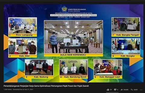 Kepala Kantor Wilayah DJP Jawa Barat I Erna Sulistyowati mengikuti acara Penandatanganan Perjanjian Kerja Sama Optimalisasi Pemungutan Pajak Pusat dan Pajak Daerah antara Direktorat Jenderal Pajak (DJP), Direktorat Jenderal Perimbangan Keuangan (DJPK), dan Pemerintah Daerah (Pemda) secara daring melalui Video Conference Zoom Meeting di Aula lantai 1 Gedung Keuangan Negara Bandung (Rabu, 21/4).