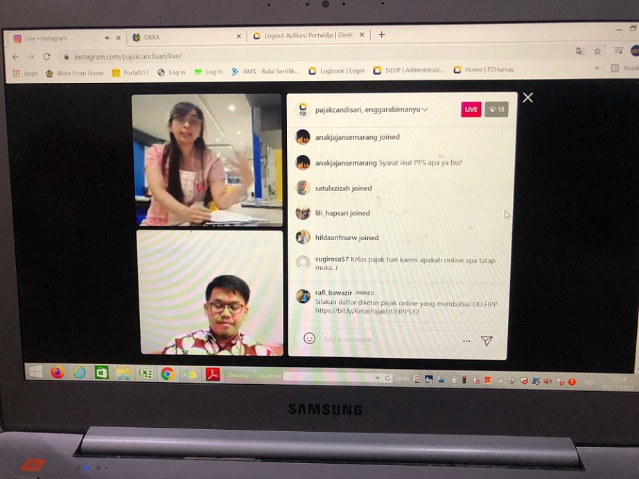 Kantor Pelayanan Pajak (KPP) Pratama Semarang Candisari menggelar live streaming melalui kanal media sosial Instagram @pajakcandisari pukul 16.00 WIB yang membahas secara umum Rancangan Undang-Undang Harmonisasi Peraturan Perpajakan (RUU HPP) yang telah disahkan Pemerintah menjadi Undang-Undang No.7 Tahun 2021 Tentang Harmonisasi Peraturan Perpajakan (UU HPP) di Semarang (Jumat, 5/11).