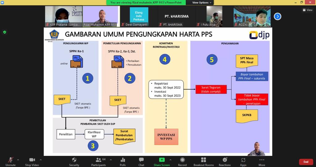 Kantor Pelayanan Pajak (KPP) Pratama Sumbawa Besar menyelenggarakan sosialisasi Program Pengungkapan Sukarela (PPS) melalui aplikasi Zoom Meeting dari KPP Pratama Sumbawa Besar (Jumat, 7/1).