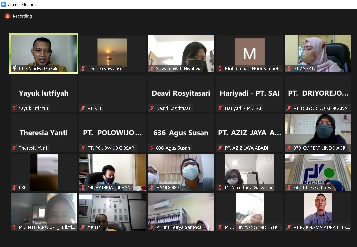 Kegiatan yang berlangsung secara daring di Gresik ini diikuti tidak kurang dari 300 peserta yang merupakan para wajib pajak di KPP Madya Gresik. Sebelumnya, mereka sudah mengisi pre-test melalui tautan yang disediakan oleh petugas KPP Madya Gresik. Sebelumnya, acara tersebut diawali dengan sambutan oleh Kepala Seksi Pelayanan KPP Madya Gresik Agus Susanto yang menyampaikan harapannya agar acara dapat berjalan dengan lancar dan dapat diikuti dengan baik oleh seluruh peserta karena akan bermanfaat dalam pelaksanaan kewajiban perpajakan para wajib pajak.