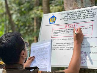 Tim penagihan Kantor Pelayanan Pajak (KPP) Pratama Magelang kembali melakukan penyitaan terhadap aset wajib pajak di Desa Kalinegoro Mertoyudan Kabupaten Magelang (Kamis, 28/07). Aset yang disita oleh juru sita adalah berupa sebidang tanah dengan luas 650 m² milik wajib pajak dengan inisila MI yang belum melunasi tunggakan pajak.