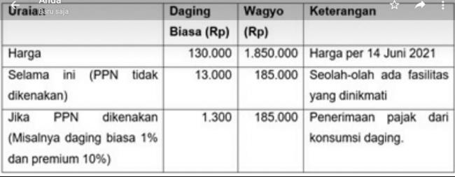 Namun, mengingat daging wagyu, bentuknya daging, yang merupakan bahan makanan pokok, sehingga mau tidak mau, selama ini tidak termasuk BKP. Artinya, tidak dikenakan PPN. Ketika suatu barang, masuk kategori untuk memenuhi kebutuhan tersier, maka pemberian faslitas pembebasan dari pengenaan PPN apakah adil ? Adilkah jika mengonsumsi daging wagyu, sama dengan mengkonsumsi daging sapi yang harganya 100 ribu rupiah, yang dijual di pasar tradisonal dan dibebaskan PPN-nya?