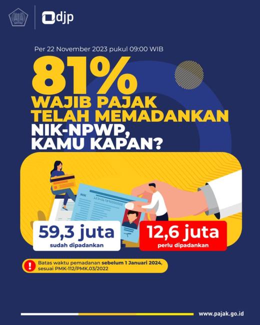 Pemadanan Nomor Induk Kependudukan (NIK) menjadi Nomor Pokok Wajib Pajak (NPWP) merupakan Amanah Undang-Undang Harmonisasi Peraturan Perpajakan Nomor 7 Tahun 2021 (UU HPP). Aturan turunannya yakni Peraturan Presiden Nomor 83 Tahun 2021 tentang Pencantuman dan Pemanfaatan Nomor Induk Kepegawaian dan/atau Nomor Pokok Wajib Pajak dalam Pelayanan Publik. Beleid tersebut menyatakan bahwa penyelenggara pelayanan publik mensyaratkan penambahan atau pencantuman NIK dan/atau NPWP penerima dalam penyelenggaraan Pelayanan Publik. Ditambah juga ada Peraturan Menteri Keuangan Nomor PMK 112/PMK.03/2022 tentang Nomor Wajib Pajak Bagi Wajib Pajak Orang Pribadi, Wajib Pajak Badan, dan Wajib Pajak Instansi Pemerintah (selanjutnya disebut PMK-112). Perlu diperhatikan pula bahwa batas waktu pemanadanan Nomor Induk Kependudukan (NIK) dan Nomor Pokok Wajib Pajak (NPWP) menurut PMK-112 adalah sebelum 1 Januari 2024. Hingga saat ini, sudah 81% wajib pajak orang pribadi yang memadankan NIK dan NPWP-nya. Masih ada kesempatan untuk segera kita padankan NIK dan NPWP.