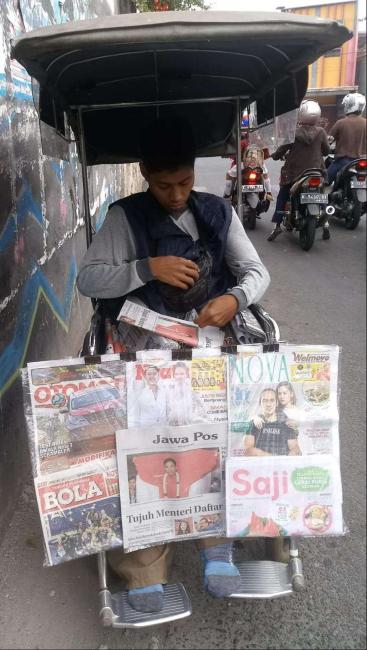 Ada satu yang menarik. Seorang pemuda kurus berkursi roda. Hampir setiap pagi saya melihatnya di sekitar jam 6.30 WIB. Seseorang yang selalu saja membuat saya penasaran, tentang cerita di balik kehidupannya. Ia, masih berada di sana menjajakan koran dengan kursi roda sampai saat Duhur menjelang.