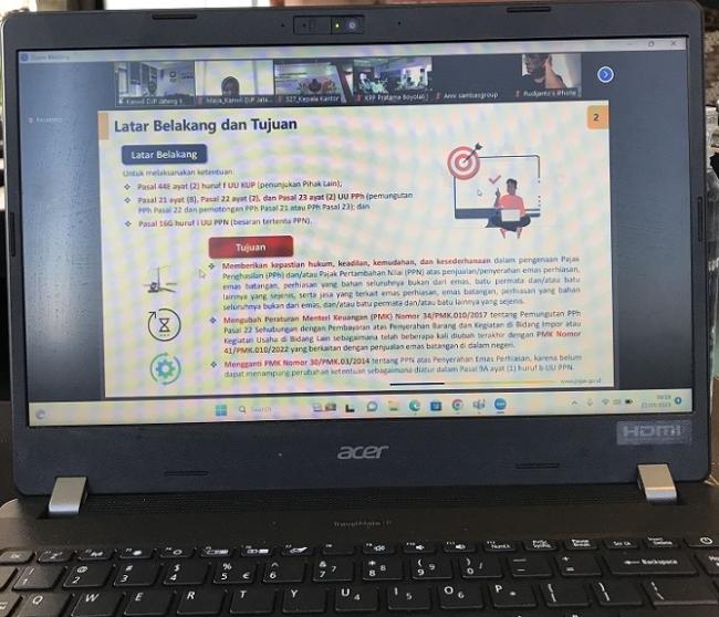 Hal ini menggelitik Tim Penyuluh Pajak untuk segera memberikan sosialisasi Peraturan Menteri Keuangan (PMK) Nomor 48 Tahun 2023 tentang Pajak Penghasilan dan/atau Pajak Pertambahan Nilai atas Penjualan/Penyerahan Emas Perhiasan, Emas Batangan, Perhiasan yang Bahan Seluruhnya bukan dari Emas, Batu Permata dan/atau Batu Lainnya yang Sejenis, serta Jasa yang Terkait dengan Emas Perhiasan, Emas Batangan, Perhiasan yang Bahan Seluruhnya Bukan dari Emas, dan/atau Batu Permata dan/atau Batu Lainnya yang Sejenis, yang Dilakukan oleh Pabrikan Emas Perhiasan, Pedagang Emas Perhiasan, dan/atau Pengusaha Emas Batangan. Kanwil DJP Jawa Tengah II beserta seluruh kantor pajak di bawahnya menyelenggarakan sosialisasi kepada seluruh pedagang emas dan perhiasan nonemas pada Senin (22/5).