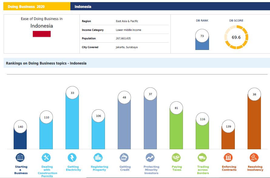 Namun dalam laporan 2020, World Bank tidak melakukan penilaian terhadap dua aspek yaitu labor market regulation dan Contracting with the Government. EODB menjadikan fokus utama keseriusan pemerintah. Presiden Jokowi memang mengejar peringkat Indonesia menjadi peringkat 40 di tahun 2020 mengingat laporan terakhir menujukan peringkat Indonesia stagnan di posisi 73. Semangat Presiden bukan tanpa sebab, semakin tingginya peringkat EODB diharapkan dapat memicu peningkatan investasi luar negeri maupun dalam negeri dan diharapkan akan menimbulkan efek positif lainnya seperti pembukaan lapangan pekerjaan dan pertumbuhan ekonomi.