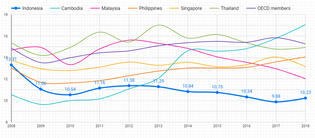 Salah satu indikator menilai kemampuan pemerintah dalam mengumpulkan penerimaan pajaknya adalah melalui tax ratio, di mana semakin tinggi penerimaan pajak suatu negara maka semakin besar juga tax ratio-nya (DPR, 2014). Menteri Keuangan RI Sri Mulyani Indrawati seperti dilansir dalam CNBC Indonesia, Jumat, 26 Juli 2019, menilai tax ratio Indonesia berada di bawah standar regional serta global. Hal ini terbukti pada Gambar I.1, jika dibandingkan dengan negara Malaysia, Singapura, Kamboja, Thailand, Filiphina, dan rata-rata negara Organisation for Economic Co-Operation and Development (OECD), tax ratio Indonesia masih tertinggal padahal berdasarkan data UNCTAD Stat, pada tahun 2005 - 2018, Foreign Direct Investment (FDI) inflows[1] ke Indonesia meningkat secara signifikan dari US$8.34 miliar (2005) ke US$21.98 miliar (2018). Peningkatan nilai FDI tersebut seharusnya diikuti juga dengan peningkatan tax ratio, namun kenyatannya tax ratio di Indonesia masih rendah.