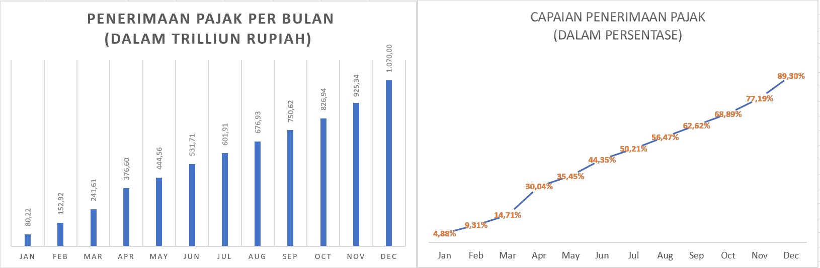 Sampai tanggal 31 Desember 2020, penerimaan pajak telah mencapai Rp1.070 trilliun atau sebesar 89,3 persen dari target APBNP 2020. Dibandingkan dengan bulan Desember 2019, penerimaan pajak di bulan Desember 2020 mengalami kontraksi sebesar 19,7 persen. Meskipun mengalami kontraksi, namun angka kontraksi ini dinilai lebih baik daripada perkiraan pemerintah yang memprediksi penerimaan tahun 2020 akan terkontraksi sebesar 21 persen. PPh Migas merupakan jenis pajak yang mengalami kontraksi paling dalam selama tahun 2020. Tercatat, penerimaan PPh Migas selama tahun 2020 mengalami kontraksi sebesar 43,9 persen dibandingkan periode yang sama tahun sebelumnya. Hal ini disebabkan karena harga minyak yang masih belum pulih dan lifting minyak yang tidak mencapai target. Di lain pihak, PPh non migas tercatat mengalami kontraksi sebesar 18,6 persen dibanding tahun sebelumnya. Dari target PPh Non Migas sebesar 1.167 trilliun, DJP berhasil mengumpulkan sebesar Rp1.036,8 trilliun atau 88,8 persen (ANTARA, 2021)