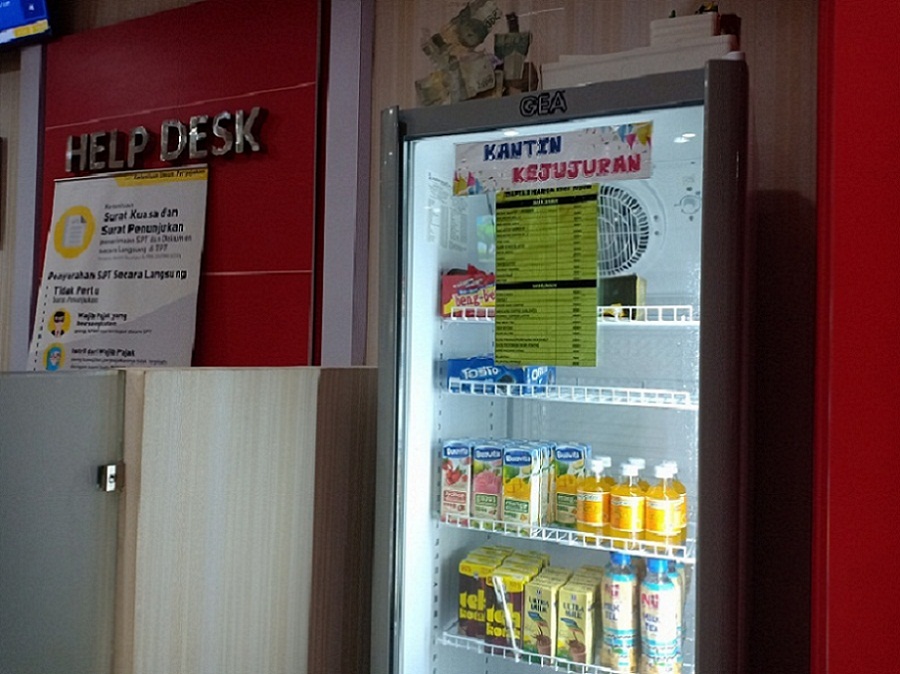Ini adalah cerita tentang kantin kejujuran di kantor kami, Kantor Pelayanan Pajak (KPP) Madya Denpasar. Ia hanyalah sebuah kulkas kecil berisi minuman dan makanan ringan yang kami tata sedemikian rupa. Tidak lupa dengan daftar harga yang tertempel di pintu depannya. Namanya saja kantin kejujuran, memang tidak ada pegawai yang berjaga sebagai kasirnya. Namun tenang saja, ada sebuah kotak kaca kecil berbentuk seperti kotak amal yang diletakkan di atas kulkas kantin kejujuran tersebut. Kotak tersebutlah yang menagih uang sang pembeli dan sudah menjadi naluri sang pembeli untuk meletakkan uangnya disana.