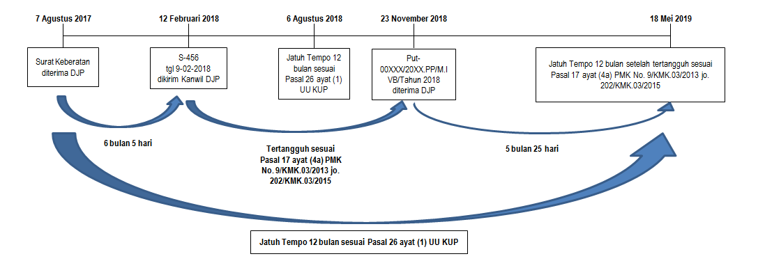 Wajib pajak kemudian mengajukan Gugatan ke Pengadilan Pajak atas surat pengembalian permohonan keberatan yang tidak memenuhi persyaratan dari Kanwil DJP nomor DEF tanggal 9 Februari 2018, pada tanggal 9 Maret 2018. Pada tanggal 23 November 2018 Direktur Jenderal Pajak menerima Putusan Gugatan dari Pengadilan Pajak Nomor Put-00XXX/20XX.PP/M.IVB/Tahun 2018 tanggal 29 Oktober 2018 dan melanjutkan kembali proses Keberatan. Berdasarkan hal tersebut, jangka waktu penyelesaian Keberatan paling lama 12 (dua belas) bulan yang semula tanggal 6 Agustus 2018 tertangguh sejak tanggal 12 Februari 2018 sampai dengan tanggal 23 November 2018. Oleh karena itu, jangka waktu penyelesaian keberatan paling lama 12 bulan sesuai dengan ketentuan Pasal 17 ayat (4a) Peraturan Menteri Keuangan Nomor 202/KMK.03/2015 tentang Perubahan atas Peraturan Menteri Keuangan Nomor 9/KMK.03/2013 dan Pasal 26 ayat (1) dan (5) UU KUP, menjadi tanggal 18 Mei 2019.