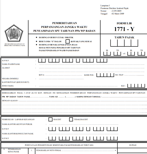 Sesuai Pasal 3 Peraturan Direktur Jenderal Pajak Nomor 21/PJ/2009 tentang Tata Cara Penyampaian Pemberitahuan Perpanjangan Surat Pemberitahuan Tahunan, pemberitahuan perpanjangan SPT Tahunan bagi wajib pajak badan atau orang pribadi yang melakukan kegiatan usaha atau pekerjaan bebas disampaikan dalam bentuk formulir kertas (hardcopy) 1770-Y/1771-Y/1771-$Y atau dalam bentuk data elektronik (e-SPTy).