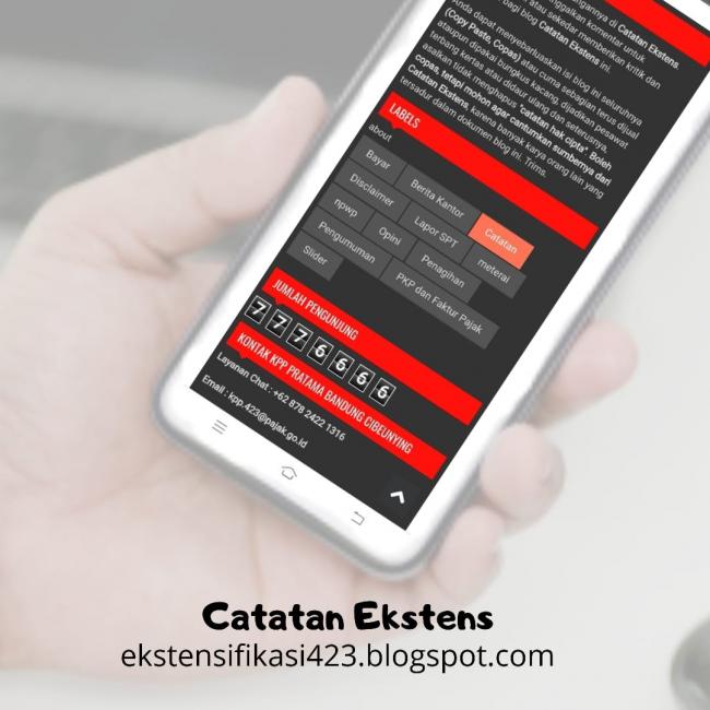 "Inilah catatanku, cerita antara aku dan kamu. Sekedar sharing pengalaman dan informasi antar teman", demikian salam pembuka di blog Catatan Ekstens ( http://ekstensifikasi423.blogspot.com) tepat di pojok kiri atas berandanya. Sekilas tampilan blog ini tampak meriah full colour dan penuh dengan materi perpajakan. Yang menarik perhatian adalah sampai dengan Mei 2020, jumlah pengunjung blog ini ternyata mencapai 7 juta lebih, tepatnya 7.870.381 (per tanggal 17 Mei 2020). Jumlah ini cukup fantastis bagi sebuah blog yang bicara tentang pajak.