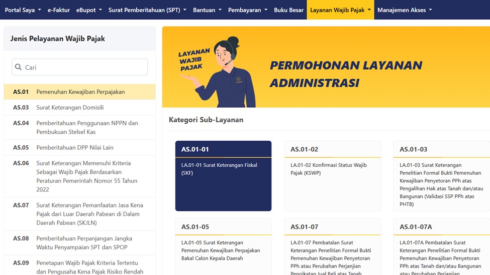 - Wajib pajak OP/wakil/kuasa memilih menu “Layanan Wajib Pajak”, lalu pilih "Layanan Administrasi" dan klik "Buat Permohonan Layanan Administrasi".