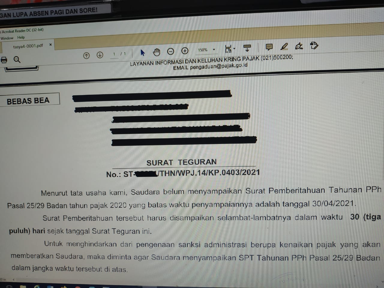 Jika Anda sebagai wajib pajak menerima surat teguran maka segeralah menghubungi Kantor Pelayanan Pajak terdekat. Anda juga dapat menghubungi media sosial setiap Kantor Pelayanan Pajak, Kring Pajak, ataupun langsung datang ke Kantor Pelayanan Pajak. Petugas penyuluhan nantinya akan melayani wajib pajak untuk berkonsultasi mengenai kewajiban perpajakannya. Petugas penyuluhan akan membantu Anda memahami bagaimana cara melaporkan SPT Tahunan PPh dengan benar, lengkap, dan jelas. Jika Anda sudah memahami caranya dan hanya terlupa karena kesibukan maka segera laporkan kewajiban Anda.
