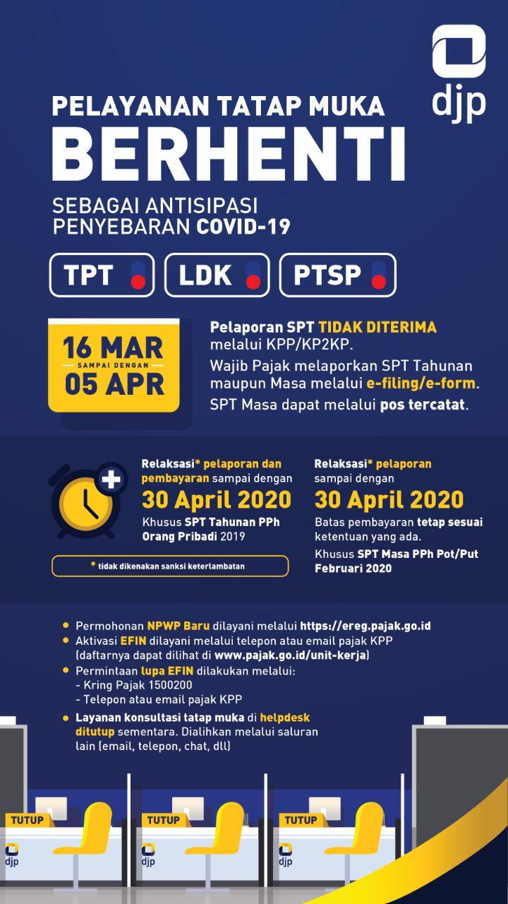 Keputusan resmi sudah dibuat. Direktorat Jenderal Pajak (DJP) memutuskan untuk meniadakan sementara pemberian layanan secara langsung (tatap muka) di Tempat Pelayanan Terpadu (TPT) pada Kantor Pelayanan Pajak (KPP) di seluruh Indonesia.