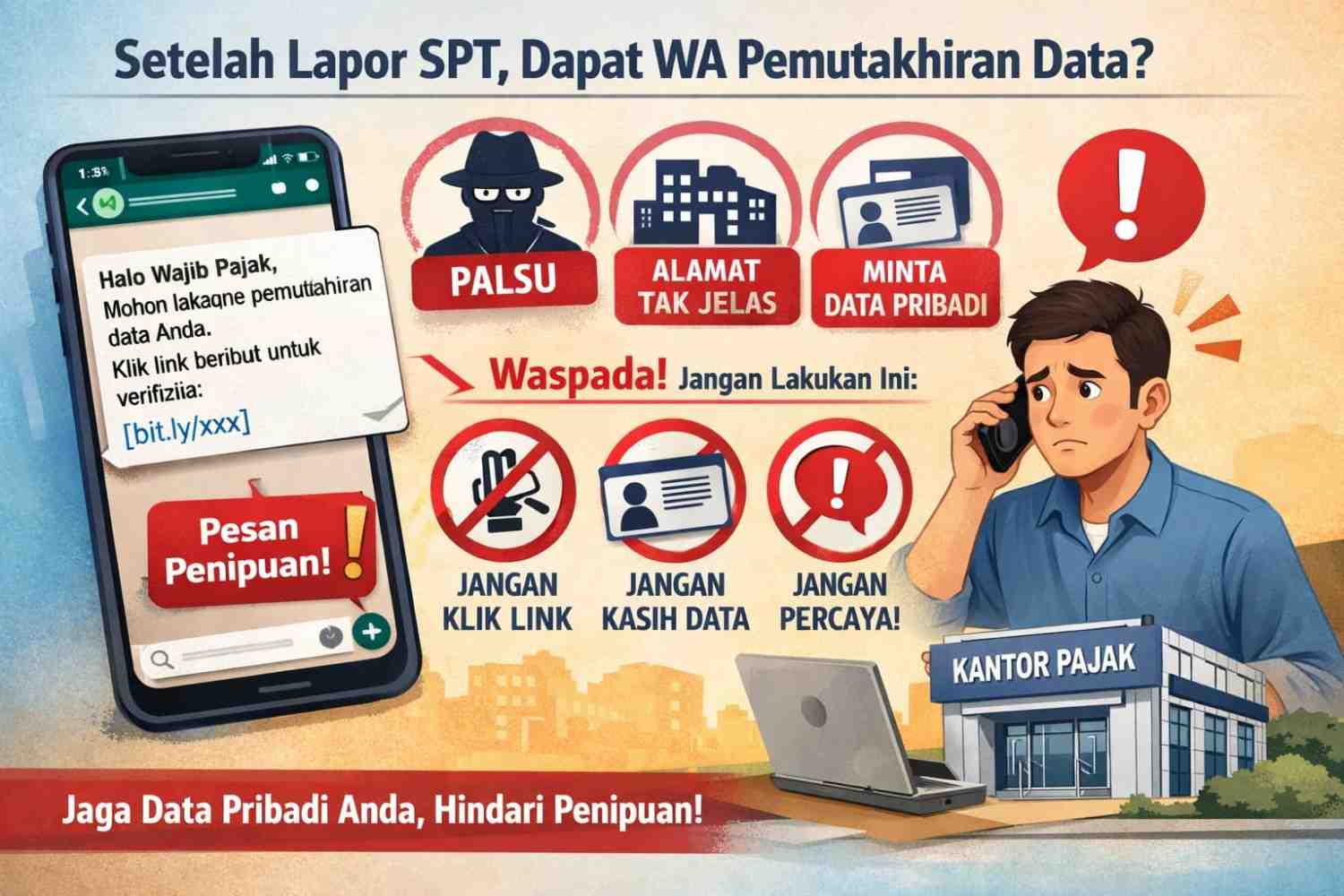 Setiap tahun, pelaporan Surat Pemberitahuan (SPT) Tahunan menjadi kewajiban bagi wajib pajak. Proses pelaporan yang semakin mudah melalui layanan daring membuat kepatuhan semakin meningkat. Namun, di tengah periode pelaporan SPT, sering muncul modus penipuan yang menyasar wajib pajak melalui pesan singkat atau aplikasi perpesanan seperti WhatsApp. Salah satu modus yang kerap terjadi adalah pesan yang mengatasnamakan petugas pajak dan meminta pemutakhiran data setelah wajib pajak menyampaikan SPT.