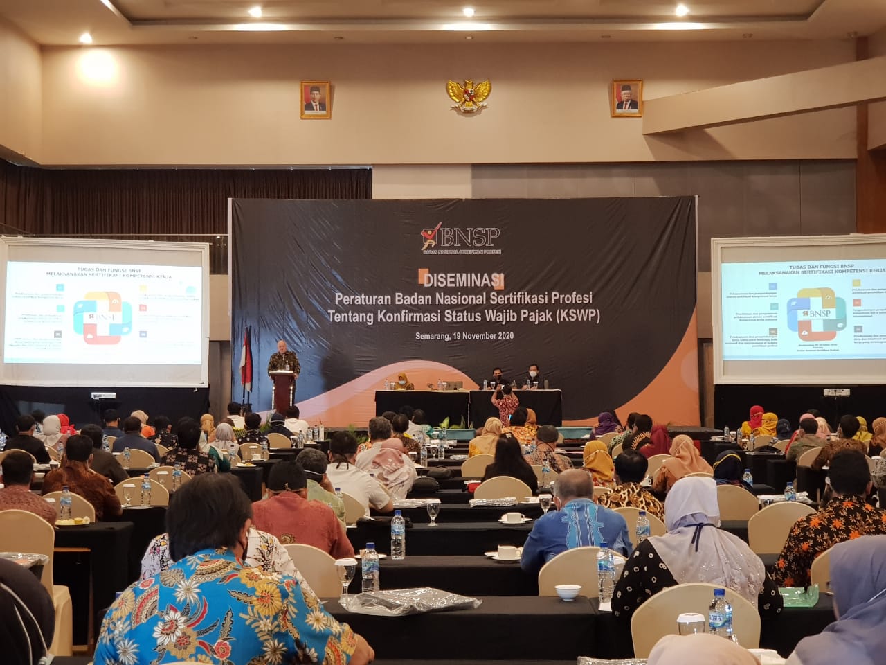 Badan Nasional Sertifikasi Profesi (BNSP) dan Direktorat Jenderal Pajak (DJP) mengadakan diseminasi tentang peraturan BNSP dan Konfirmasi Status Wajib Pajak (KSWP) di MG Setos Semarang (Kamis, 19/11). Diseminasi ini merupakan rangkaian acara yang dilaksanakan BNSP dan DJP sejak Senin, 2 November 2020 lalu di lima kota besar di Indonesia yang mencakup Surabaya, Bali, Jakarta, Semarang dan Bandung.