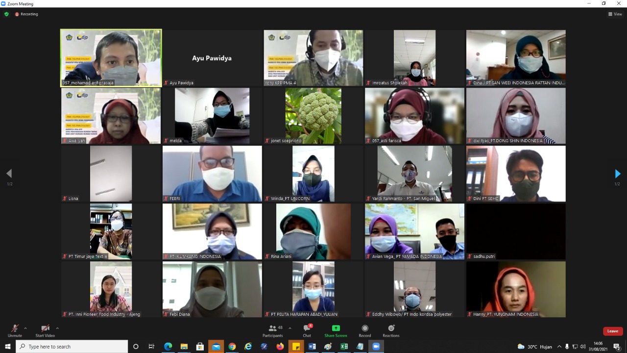 Kantor Pelayanan Pajak Penanaman Modal Asing (KPP PMA) Empat menyelenggarakan kegiatan kelas pajak secara daring melalui aplikasi Zoom Meeting dari Gedung KPP PMA Empat di Kalibata, DKI Jakarta (Selasa, 31/8).