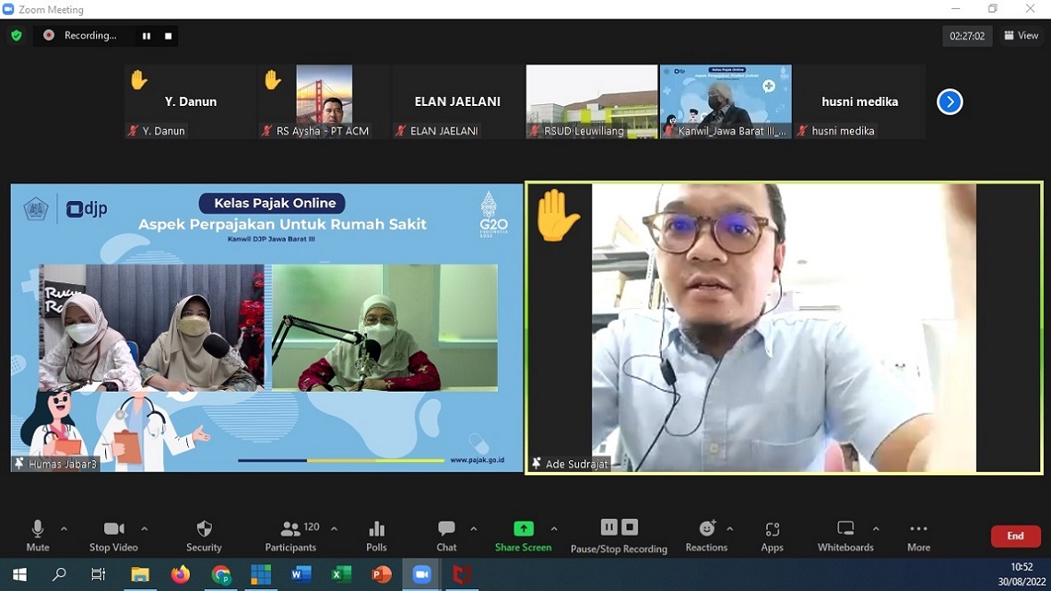 Kantor Wilayah (Kanwil) Direktorat Jenderal Pajak (DJP) Jawa Barat III melakukan sosialisasi "Aspek Perpajakan Bagi Rumah Sakit" kepada Rumah Sakit dan Klinik baik yang berada di wilayah Kota Bogor, Kota Bekasi, Kota Depok, dan Kabupaten Bogor secara daring dalam bentuk Kelas Pajak, Kota Bogor (30/8).