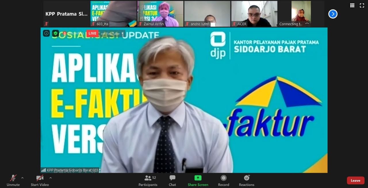 Sekitar 150 Wajib Pajak KPP Pratama Sidoarjo Barat mengikuti sosialisasi Aplikasi e-Faktur versi 3.0 melalui Zoom Meeting di Sidoarjo (Rabu, 23/9). Sosialisasi ini juga ditayangkan secara langsung dan diunggah ke kanal Youtube KPP Pratama Sidoarjo Barat sehingga wajib pajak yang tidak mengikuti webinar tetap dapat menonton video tersebut.