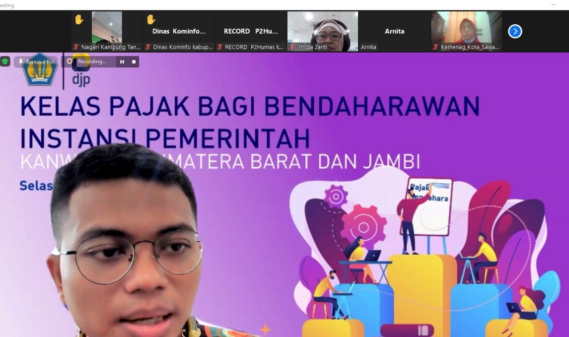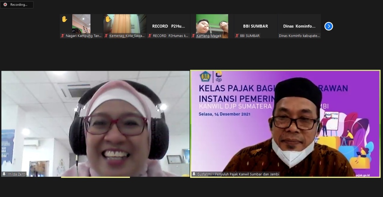 Kantor Wilayah Direktorat Jenderal Pajak (Kanwil DJP) Sumatera Barat dan Jambi kembali mengadakan kelas pajak bagi Bendaharawan Instansi Pemerintah secara daring yang diikuti lebih dari 240 Bendaharawan Instansi Pemerintah di Provinsi Sumatera Barat dan Jambi (Selasa, 14/12).