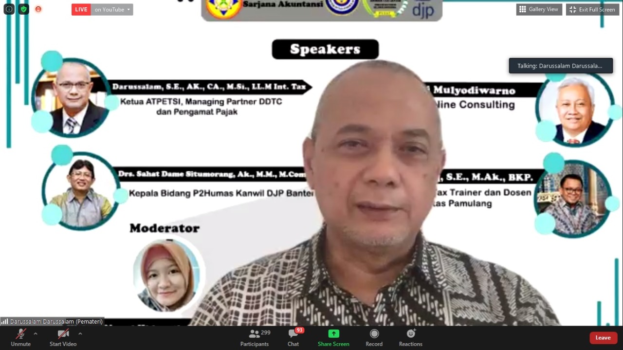 Sahat Dame Situmorang, Kepala Bidang Penyuluhan, Pelayanan, dan Hubungan Masyarakat Kantor Wilayah DJP Banten yang menjadi pemateri dalam seminar nasional kali ini, berbicara tentang kondisi kepatuhan pajak dan usaha pemerintah dalam menghadapi pandemi Covid-19. Sahat mengatakan pemerintah, khususnya DJP telah merespon keresahan masyarakat dengan membuat berbagai kebijakan dalam rangka mendukung program Pemulihan Ekonomi Nasional.