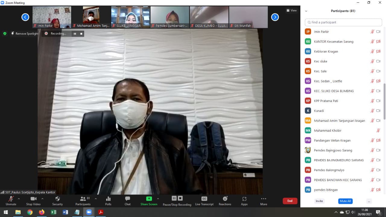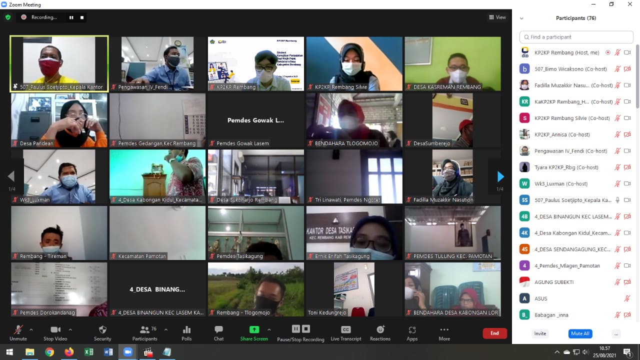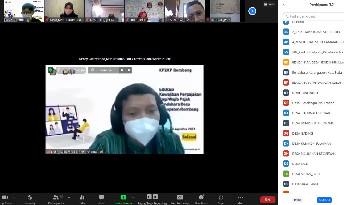 Kantor Pelayanan, Penyuluhan, dan Konsultasi Perpajakan (KP2KP) Rembang bersama dengan Tim Penyuluh dari Kepala Kantor Pelayanan (KPP) Pratama Pati mengadakan edukasi kewajiban bendahara pemerintah bagi Wajib Pajak Bendahara Desa secara online melalui Zoom Meeting di Rembang (Selasa, 24/8).