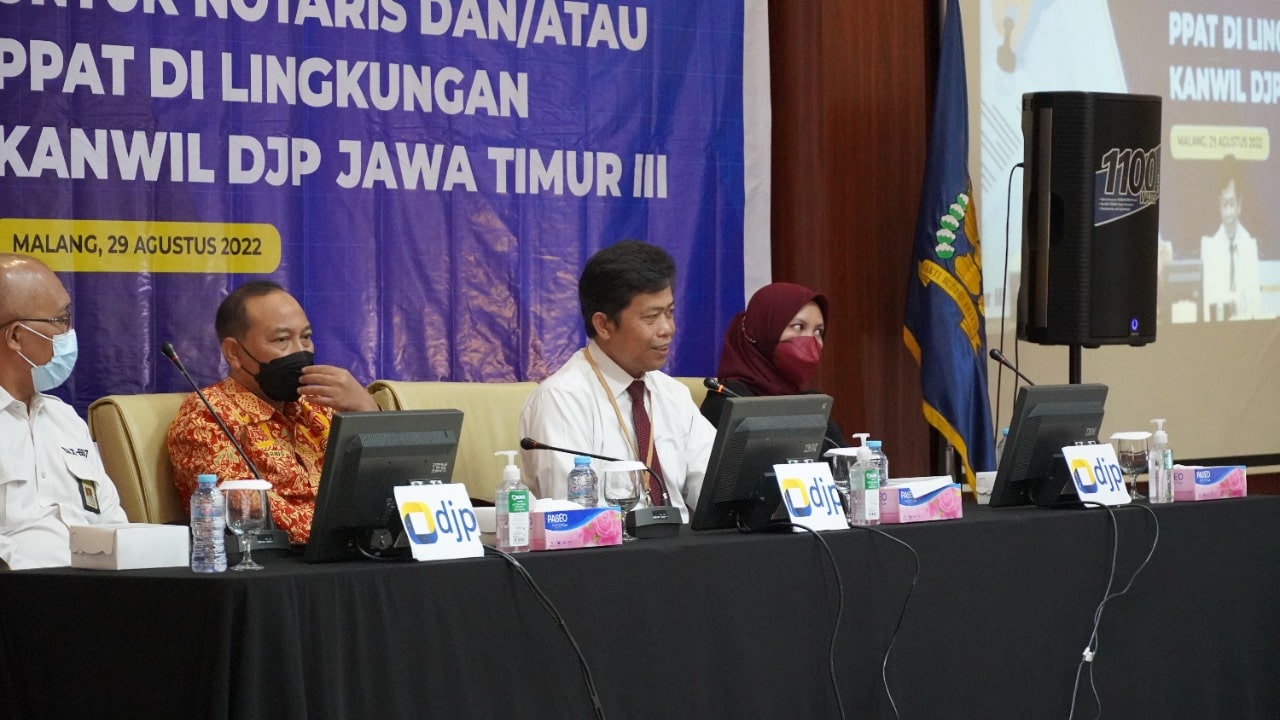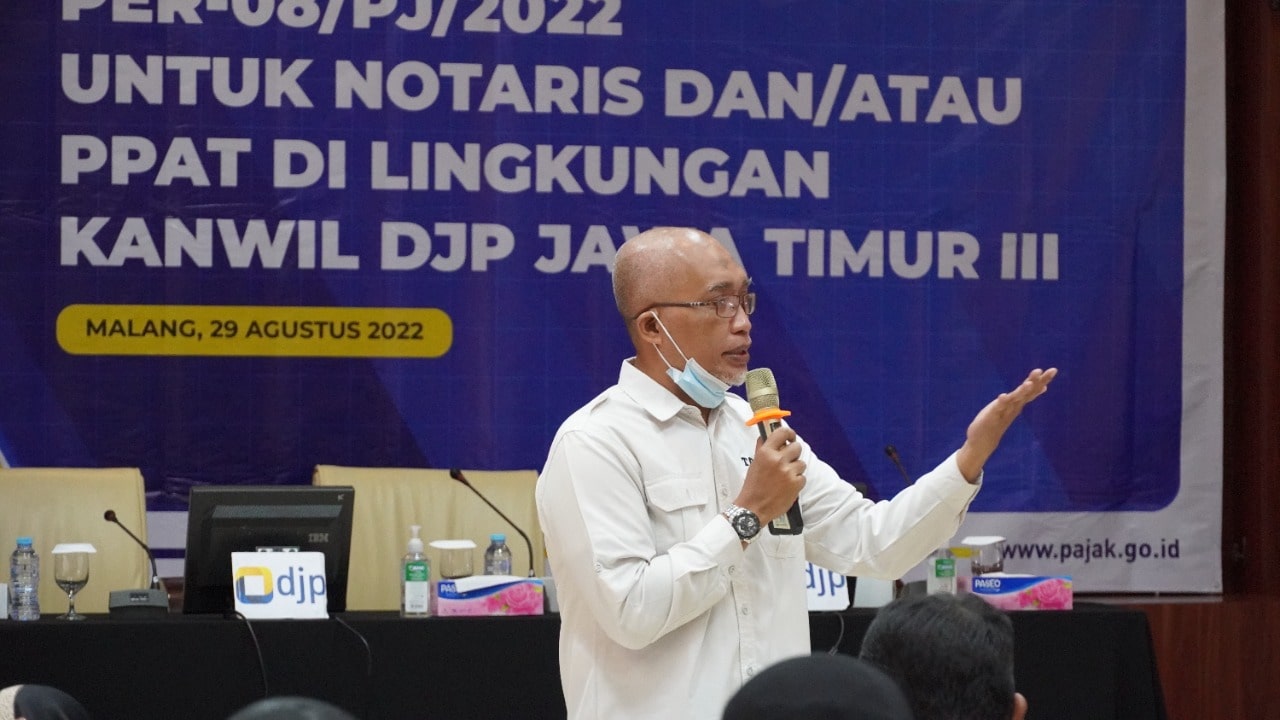 Kantor Wilayah Direktorat Jenderal Pajak (Kanwil DJP) Jawa Timur III menggelar Sosialisasi tentang NIK menjadi NPWP dan Kewajiban Pajak sesuai Peraturan Direktur Jenderal Pajak Nomor PER-08/PJ/2022 secara hybrid di Aula Kanwil DJP Jawa Timur III (Senin, 29/8). Sosialisasi yang dibuka oleh Kepala Bidang P2Humas Idham Budiarso, diikuti oleh 360 Notaris dan PPAT di lingkungan Kanwil DJP Jawa Timur III.